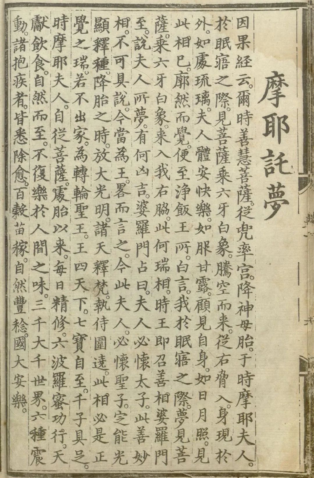 因果经云。尔时善慧菩萨。从兜率宫降神母胎。于时摩耶夫人于眠寤之际。见菩萨乘六牙白象腾空而来。从右胁入。身现于外。如处琉璃。夫人体安快乐。如服甘露。顾见自身如日月照。见此相已。廓然而觉。便至净饭王所。白言我于眠寤之际。梦见菩萨乘六牙白象来入我右胁。此何瑞相。