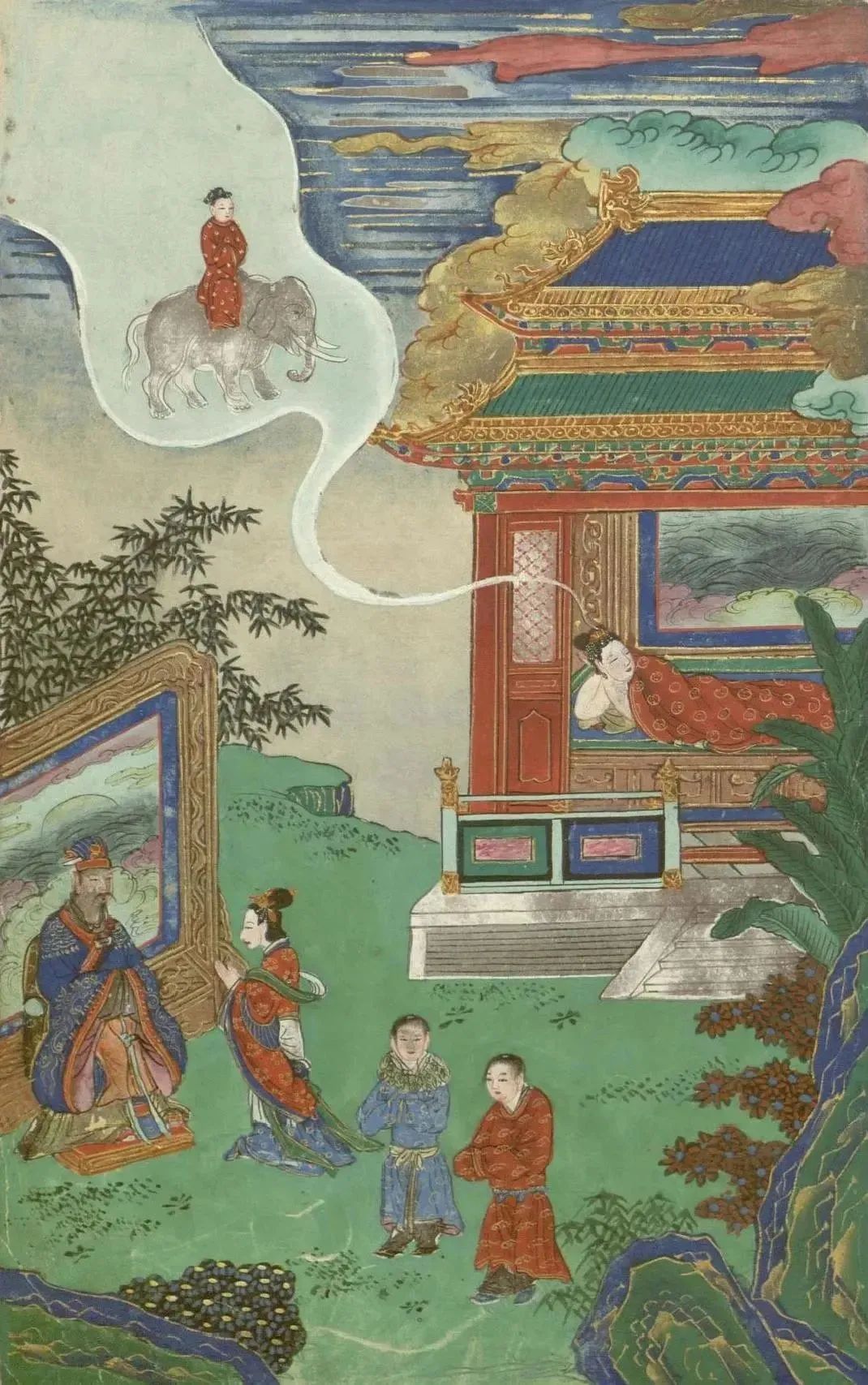 《因果经》上说:当善慧菩萨从兜率天宫降生母胎之时,摩耶夫人正在睡梦中,忽见一菩萨乘六牙白象腾空而来,从右胁而入。顿时感到自身光明莹洁,如净琉璃,身心舒畅轻安,如饮甘露,快乐无比。一觉醒来,便把梦中所见之事告知净饭王。