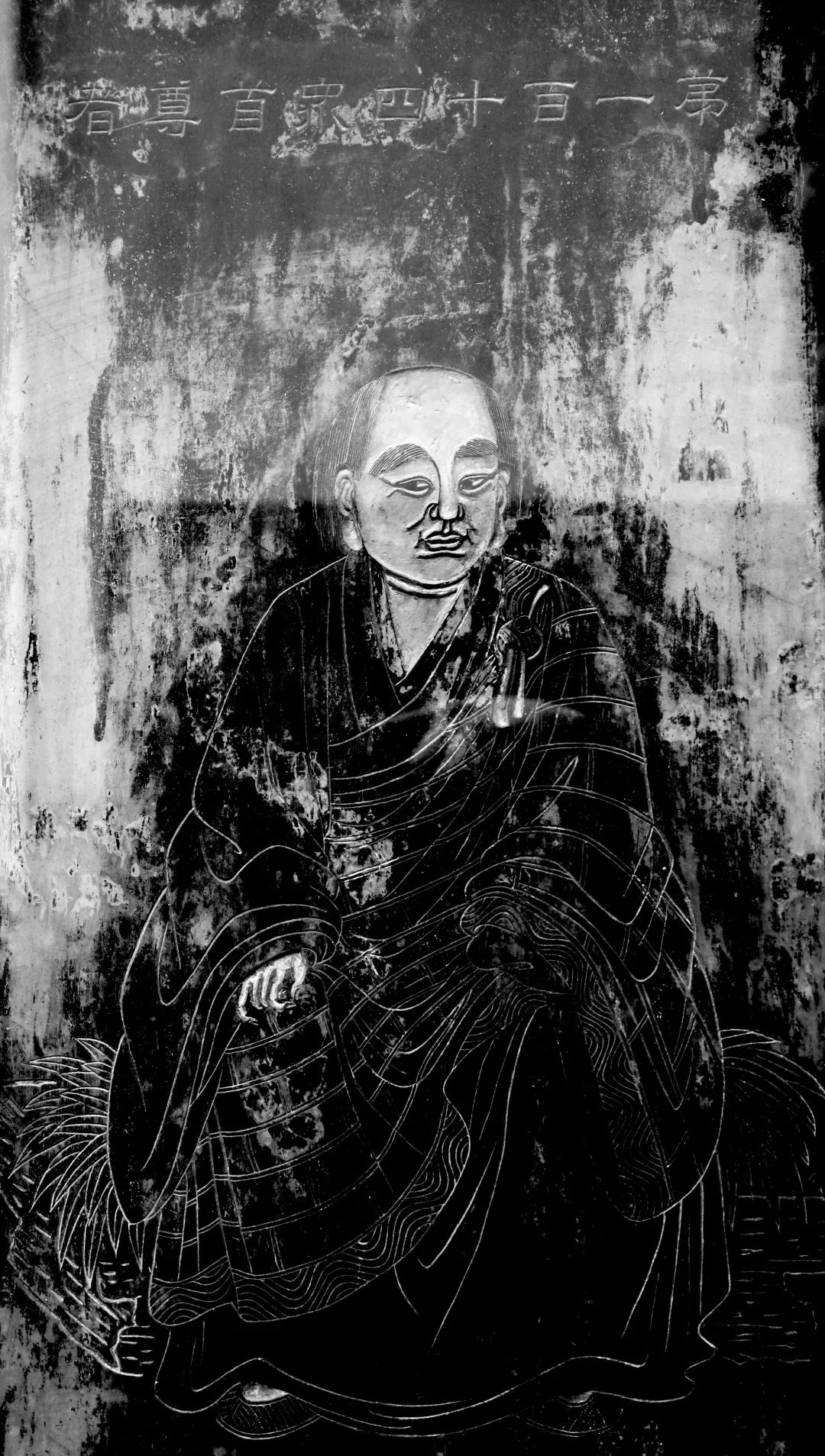 尊者法相所现为安然端坐,身披华丽袈裟,左手笼袖,右手结印抚膝,神态祥和清净。尊者智慧无罪,神通广大,能降伏邪魔,使众生安住清净。