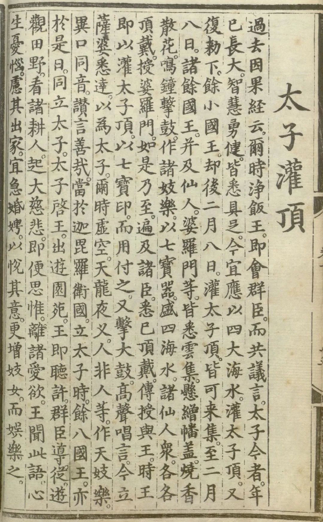 至二月八日。诸余国王。并及仙人。婆罗门等皆悉云集。悬缯幡盖。烧香散花。鸣钟击鼓。作诸伎乐。以七宝器。盛四海水。诸仙人众。各各顶戴。授婆罗门。如是乃至遍及诸臣。悉已顶戴。传授与王。时王即以灌太子顶。以七宝印而用付之。又击大鼓。高声唱言。今立萨婆悉达以为太子。