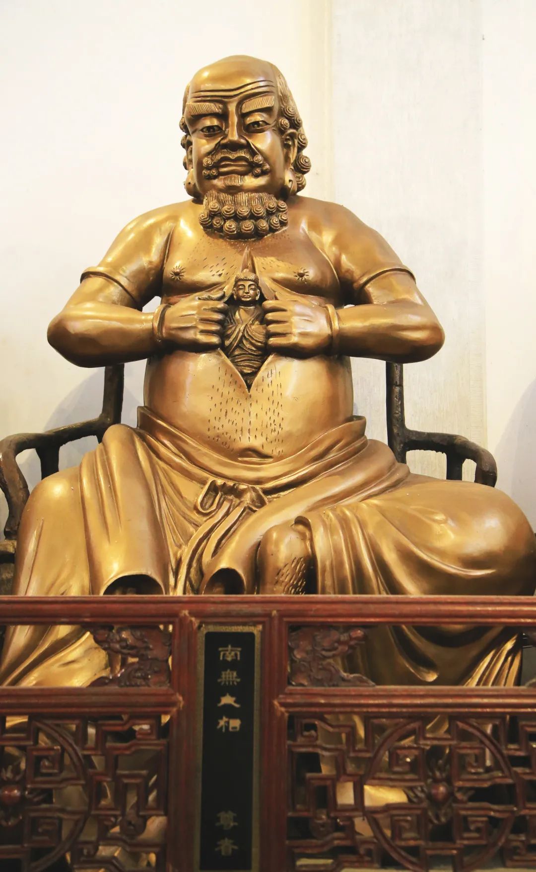 尊者法相所现为赤脚而坐,左腿盘于座上,手开肚腹,现出佛像,象征佛驻心中。尊者智慧无量,品行俱足,号“大庄严如来”。