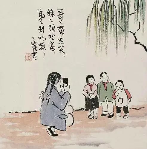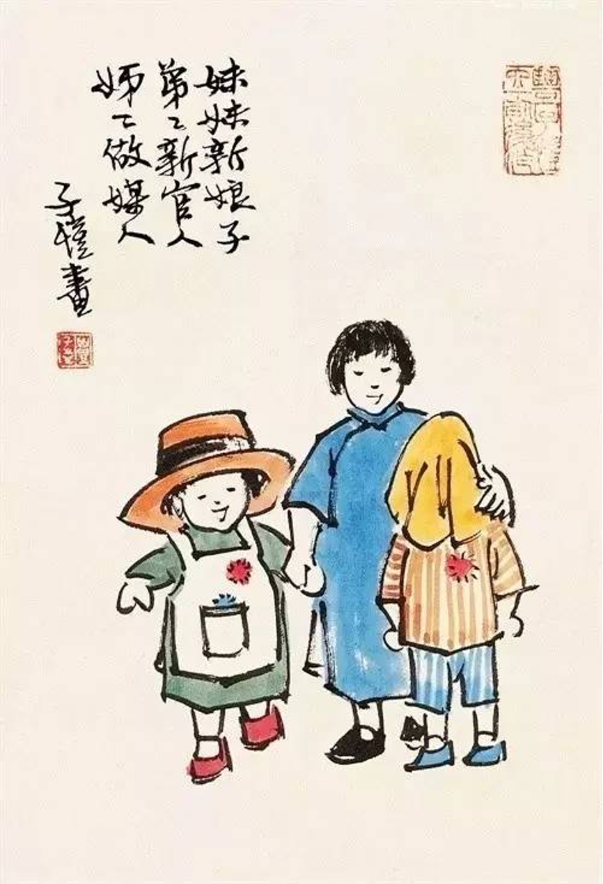以上原都是过去的事,但是常常切在我的心头,使我不能忘却。现在,你已做中学生,不久就要完全脱离黄金时代而走向成人的世间去了。我觉得你此行比出嫁更重大。古人送女儿出嫁诗云:“幼为长所育,两别泣不休。对此结中肠,义往难复留。”你出黄金时代的“义往”,实比出嫁更“难复留”,我对此安得不“结中肠”?所以现在追述我的所感,写这篇文章来送你。你此后的去处,就是我这册画集里所描写的世间。我对于你此行很不放心。因为这好比把你从慈爱的父母身旁遣嫁到恶姑的家里去,正如前诗中说:“自小闺内训,事姑贻我忧。”事姑取甚样的态度,我难于代你决定。但希望你努力自爱,勿贻我忧而已。