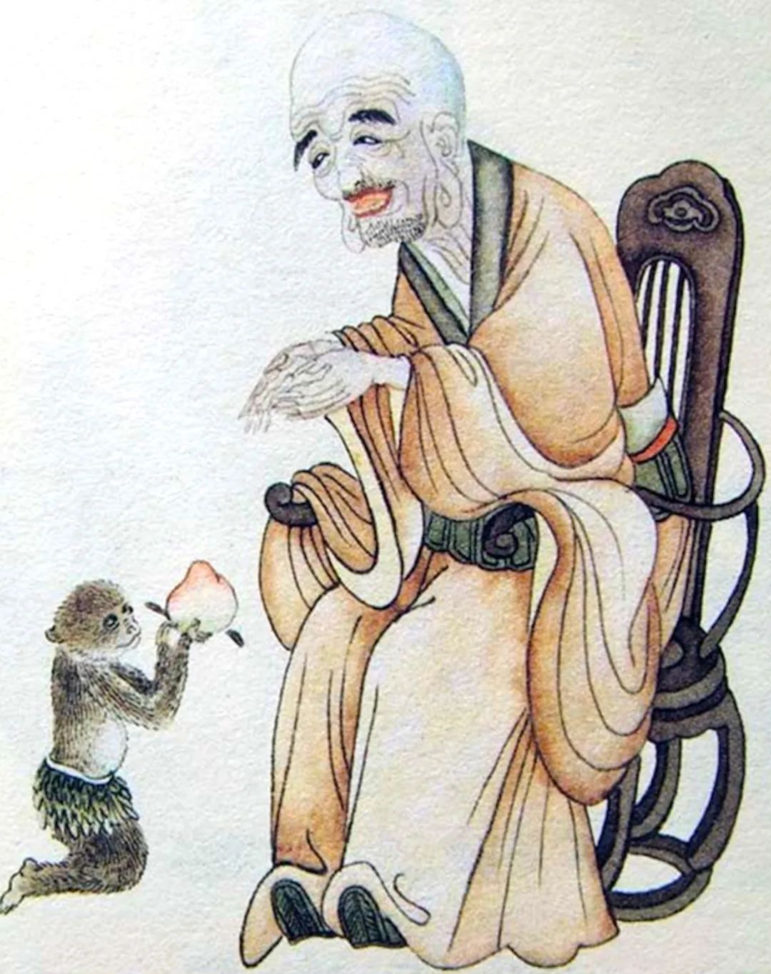 尊者法相所现为陶然而坐,双手合拢接灵猴供桃,眉目清瘦,天真宁静,笑逐颜开。尊者自性清净,无所挂碍,甘于平淡,不畏清苦。