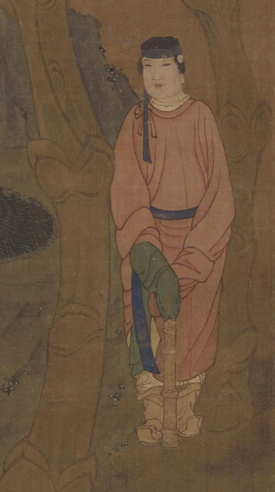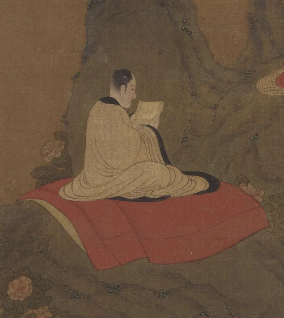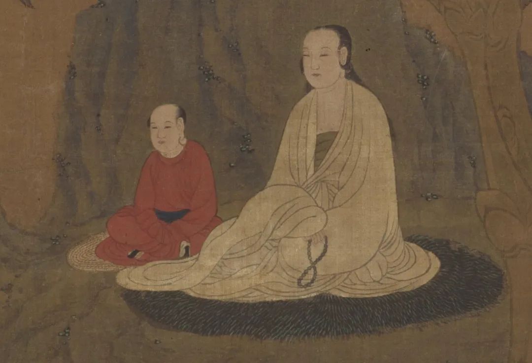 图绘观音大士,身披白衣,坐于金刚岩之上,与弟子说法的场景。这个场景似乎是以《华严经》中善财童子参观音菩萨的内容绘制。