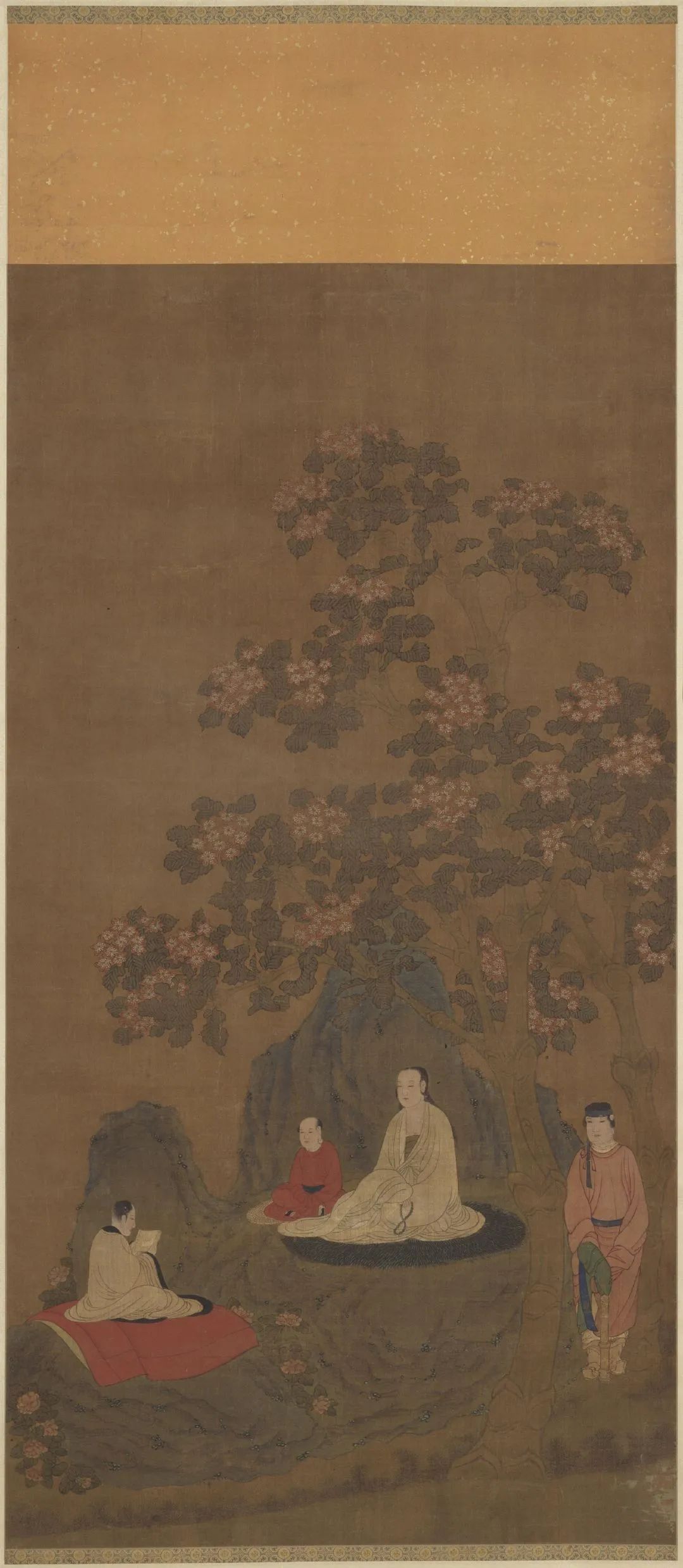 人物线条圆劲,部分人物面相略为变形,神态生动。图中花木绮丽,花木的枝干、花、叶均以爽利的墨线勾廓,填以浓厚的颜料。设色清丽而古雅,极富装饰性,描绘出平和安详的佛国境界。图中菩萨造型比较接近世俗凡人,带“世间像”,不仅反映了作者细腻、高古、夸张的风格特色,而且呈现出“居士艺术”的鲜明特质。佛教信仰与日常生活的结合,佛典与艺术的相互兼顾,这也是晚明释道画的普遍特征。