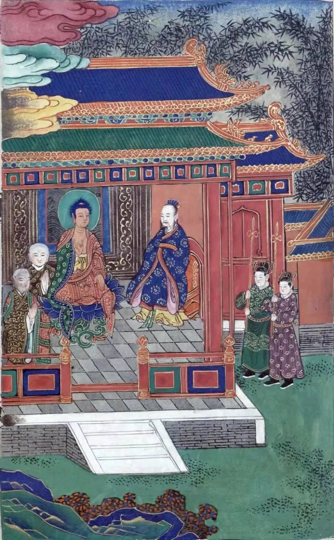 这时国王手执宝瓶,盛满香水,走到佛前,说道:“我今以此竹园奉上如来及众比丘僧,唯愿世尊哀愍纳受。”佛默然受之,遂为王说偈祝愿。