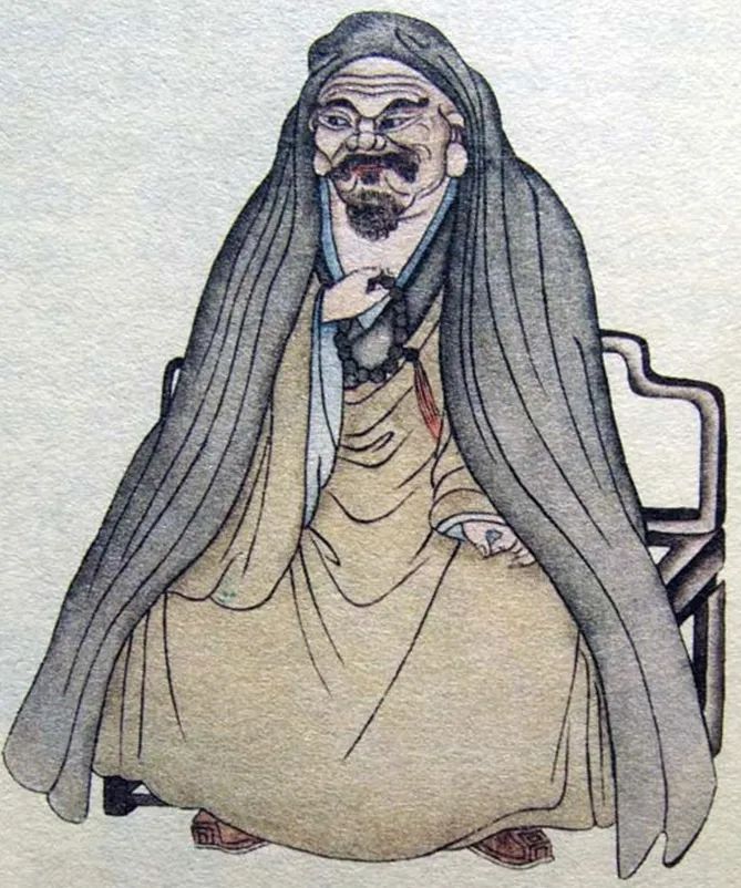 尊者法相所现为安然端坐,右手于胸前执念珠,左手于左膝结印,挂络覆顶,神态刚毅冷静,有勇猛之气。
