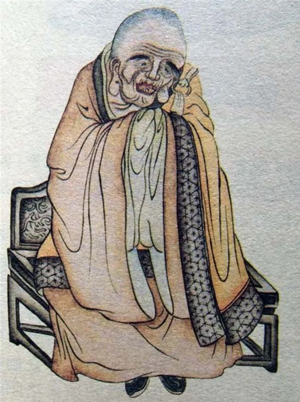 尊者法相所现为稍侧而坐,浓眉大耳,双手笼于袖中。
