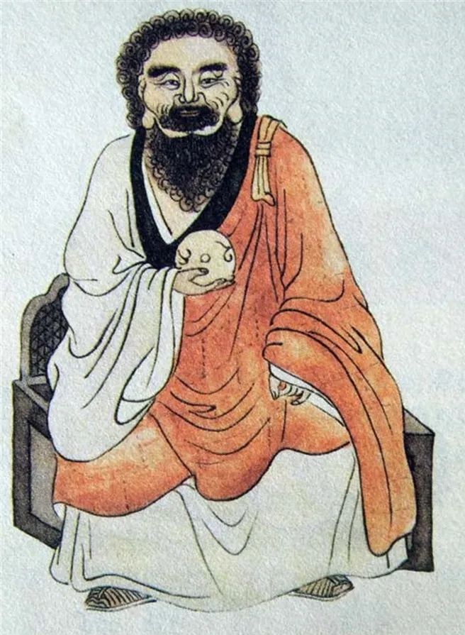 尊者法相所现为正面而坐,面含笑容,鬈发长须,右手持法器,左手结印。