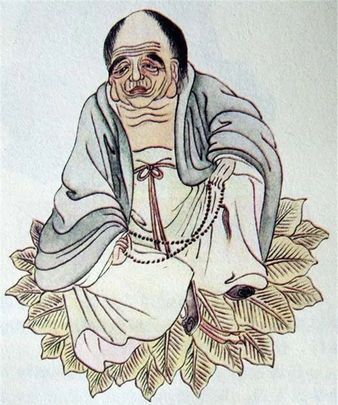 尊者法相所现为正面而坐,长眉大耳,神态严肃,双手持念珠。
