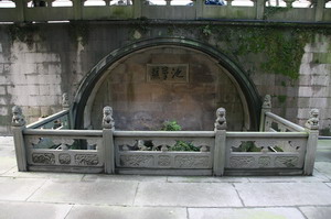位于寺中大悲阁后。相传一线天石室上有一小圆洞漏天光,悬岩刻有"佛国"二字,为上天竺僧人道行所书。唐时有丁飞(字瀚之)曾住石室学养生术,年八十六而壮;丁飞善书小楷,其蘸笔池建于寺中。