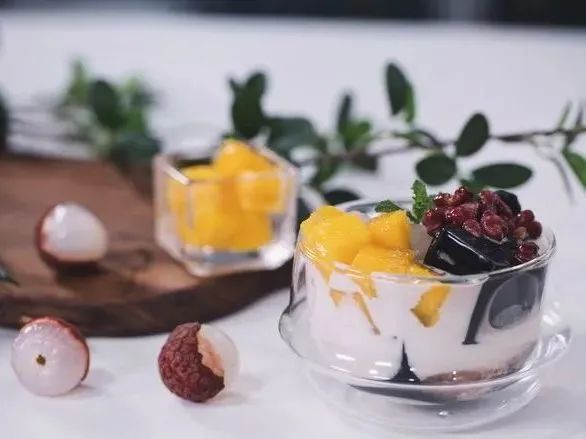 4、放入准备好的荔枝、蜜豆、芒果,再倒入椰汁,最后用薄荷叶点缀即可