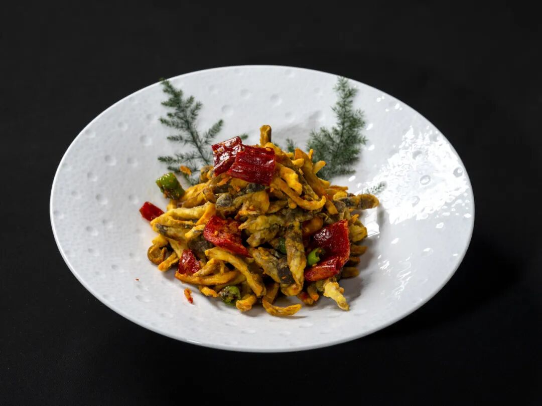 ②制作过程:将焯水后的鸡枞菌裹适量的面粉和生粉,下五成热的油锅炸脆后捞出。热锅加油后把杭椒和生姜一起煸炒,再加入刚炸好的鸡枞菌和脆椒,加盐等调味后即可出锅。