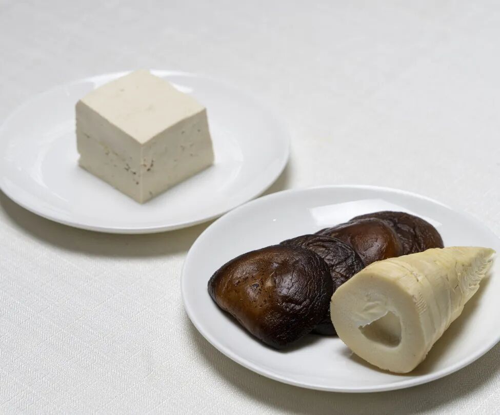 老豆腐、泡发的香菇、冬笋、生姜等。