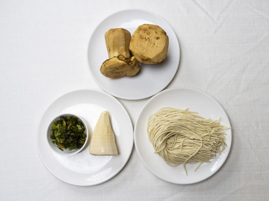 将新鲜笋剥皮、清洗干净后切片,雪菜切丁,牛肝菌切片,准备好面条。