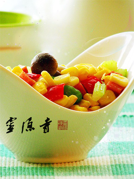 【原料】嫩玉米100克、青豆20克、西芹20克、青红椒各1个、蟹味菇少量。