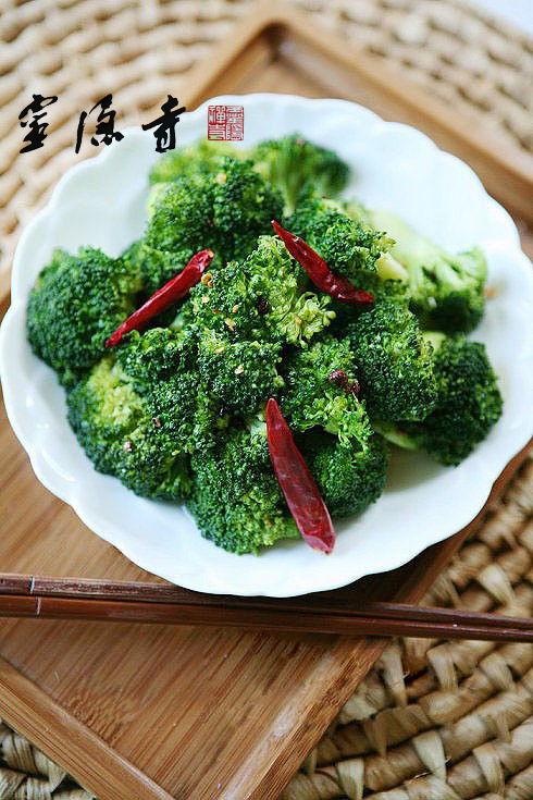 第二步:开火倒油,等到油五成热的时候放入花椒和辣椒爆出香味后,放入西兰花翻炒,不用炒太长时间,翻几下就可以,然后加如盐、糖(提鲜用,不需多放) ,关火后在撒入少许蘑菇精即可。
