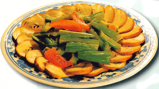 主料:主,配料:苦瓜2条,姜1块,番茄、素几卷各适量。调料:白糖20克,醋10克,精盐5克,芝麻油15克,味精5克。