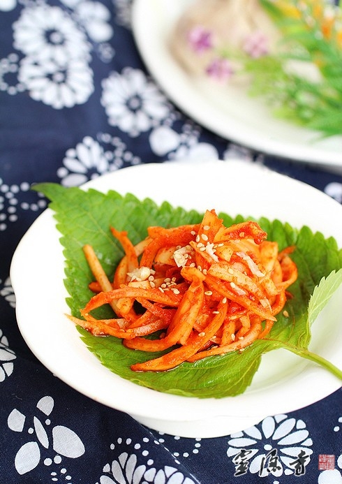 3.处理好的桔梗,加入适量的盐、糖、辣椒粉或者辣椒酱、香油、芝麻然后抓匀,放入冰箱冷藏腌制48小时即可食用。