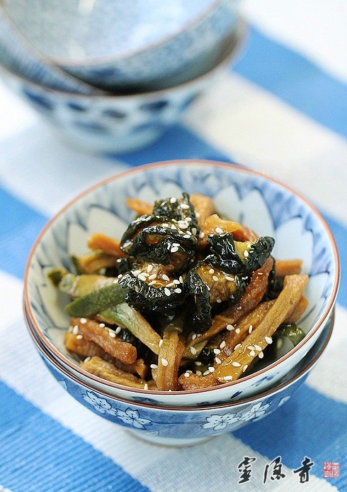 3.洗干净的干菜装入容器中,加入生抽,生抽的量没过干菜为佳,然后加入芝麻油拌匀,浸24小时即可食用,吃前撒少许白芝麻即可。