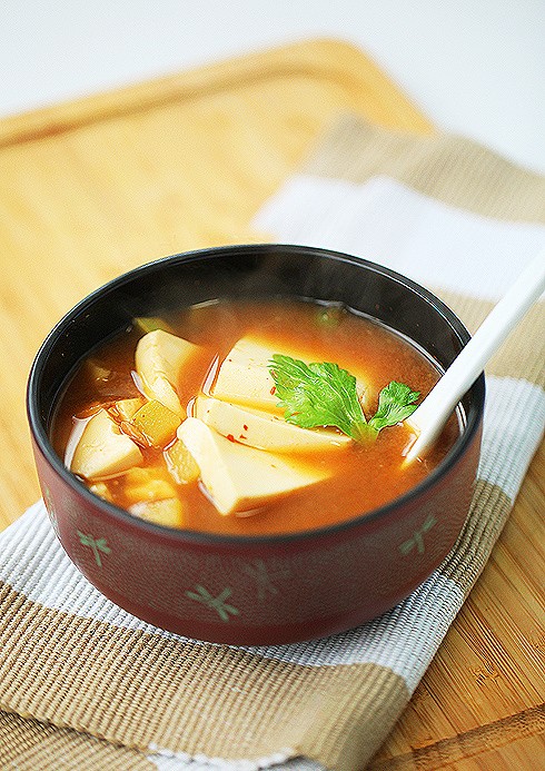 【原料】:韩式大酱3汤勺、土豆1个、嫩豆腐1小盒、西葫芦1/4个、辣椒1个、色拉油1汤勺、辣椒粉少许、芹菜叶少许、水500ML