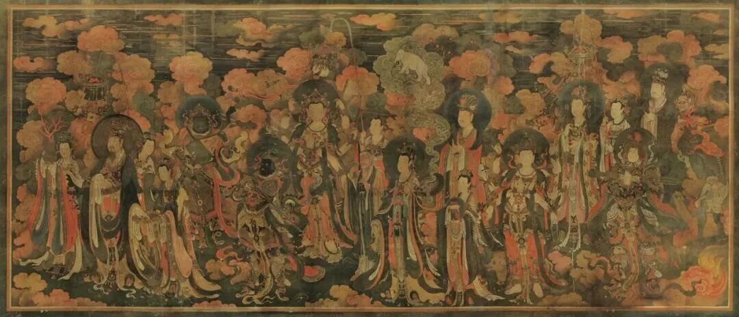 释尊从兜率天宫下生人间时,化现出七宝金阶,帝释天在释尊的左前方,手执宝盖,和右前方的大梵天,一起侍候着释尊,并为引路;
