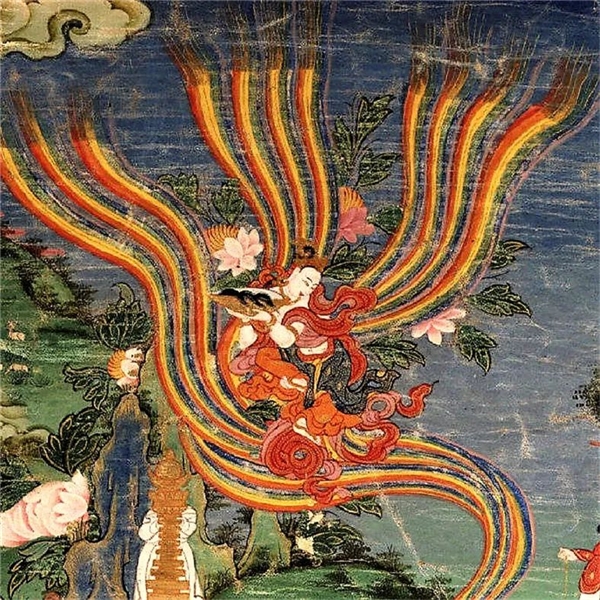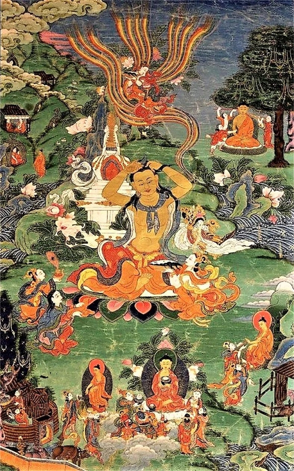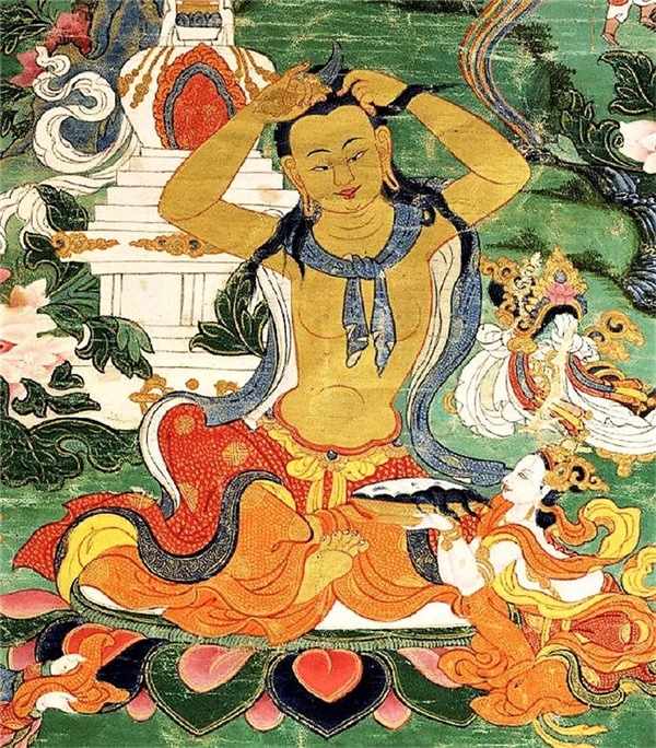 《悉达多太子削发出家图》图中描绘的是释迦牟尼佛跃城出家后在林中剃度的场景,此画精美细腻,人物清新亮丽,是描绘悉达多太子削发出家绘画中最为精美传神的一幅。