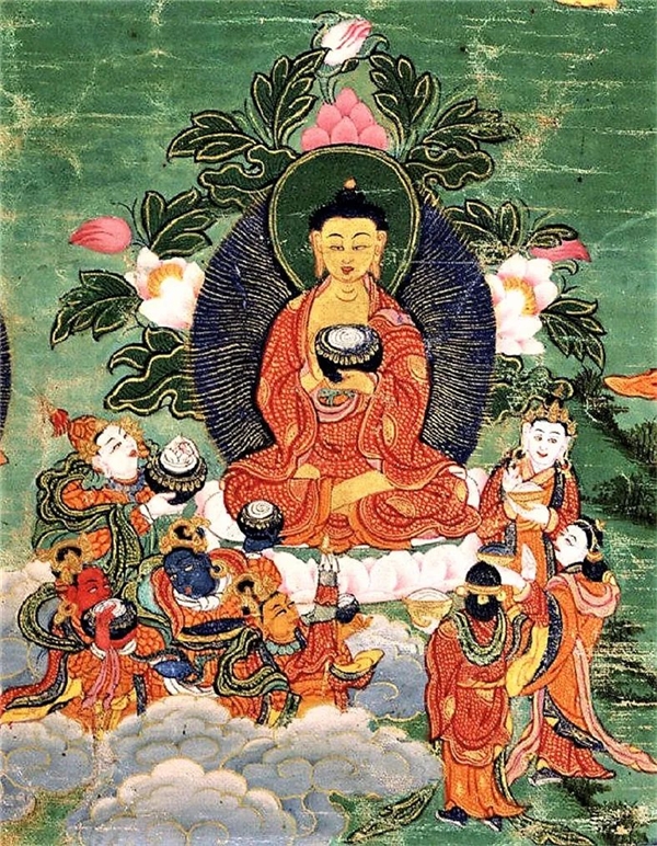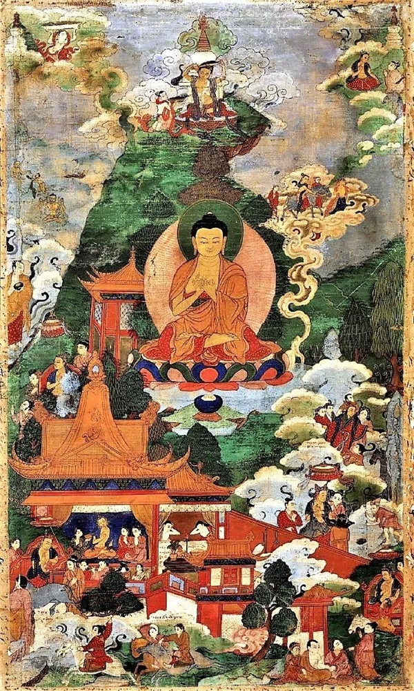 《悉达多太子削发出家》这幅精美的唐卡来自十八世纪的蒙古,画面是释迦牟尼佛本生图。中央主尊释迦牟尼佛发髻高隆,宝珠顶严。面相圆润、双目微垂、神态安详、法相庄严。身着袒右肩佛衣,双手当胸结说法印,双足呈金刚跏趺座安住于莲座之上。