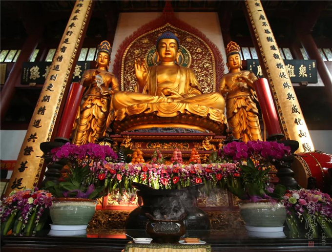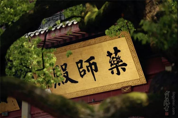 杭州灵隐寺药师殿是单层重檐歇山顶式的大殿,于1993 年正式开光。殿中莲台座上结跏趺坐的是药师佛,左边站立的是日光菩萨,手托太阳,象征着光明;右边站立的是月光菩萨,手托月亮,象征着清凉。药师佛、日光菩萨、月光菩萨合称为"东方三圣"。