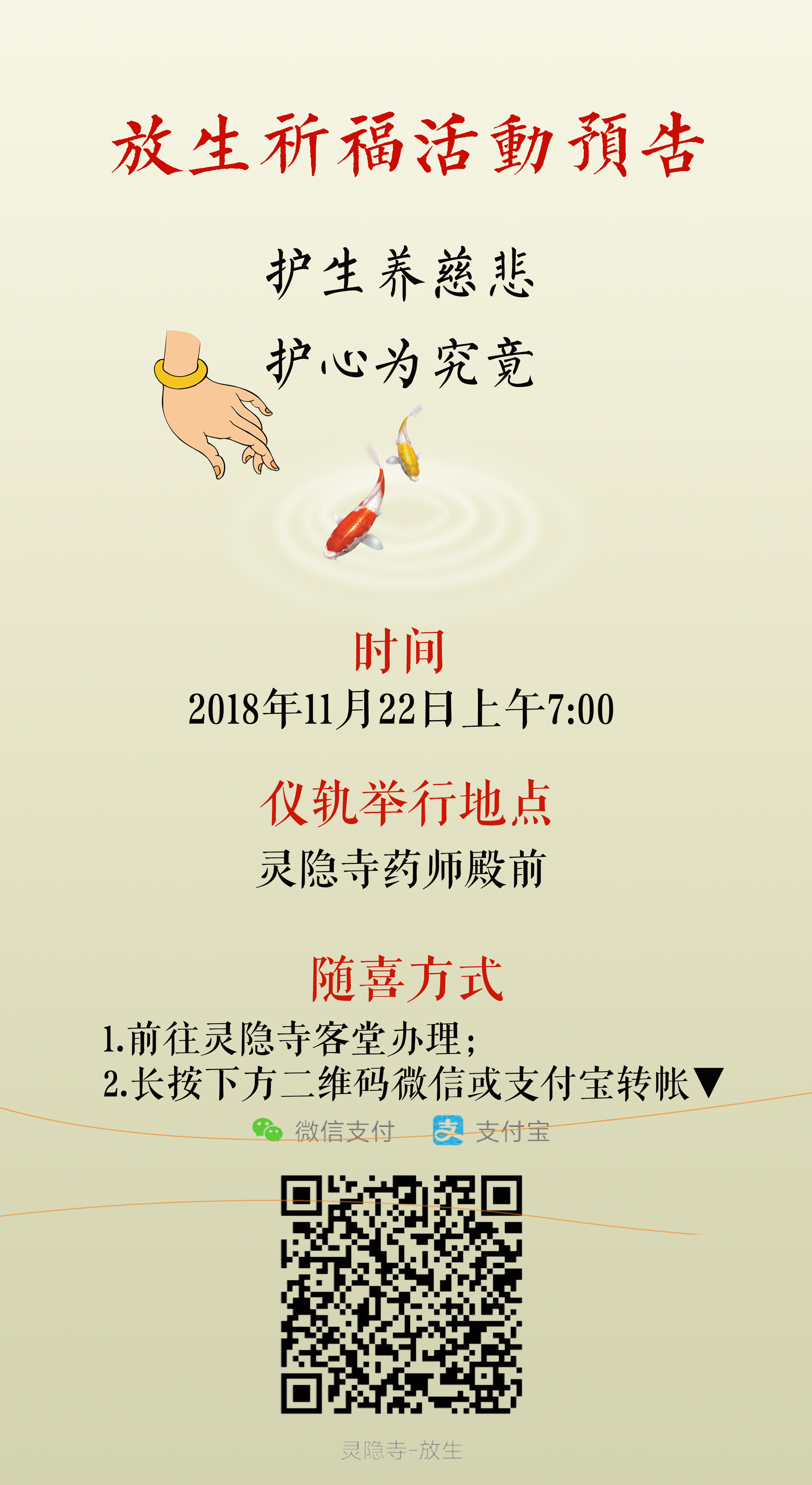为救拔有情,利益大众,杭州灵隐寺将于每月农历十五上午七时在灵隐寺药师殿前定期举行放生祈福法会,为方便大众参与,现将随喜方式公布如下: