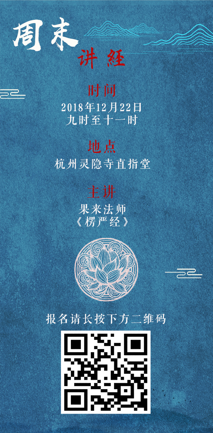 《楞严经》指导修行者如何从凡夫位直至成就涅槃之果。全经从明心见性开题,世尊循循善诱,破解修行路上种种疑惑和歧见,彻底拔出众生生死之根源,开示如来无上甚深微妙义理。本周末将由来自杭州佛学院教理院的果来法师为大众讲解《楞严经》。