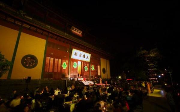 聚餐结束后,灵隐寺在大雄宝殿前举行了中秋普茶会,僧俗弟子一起同台表演自己的拿手绝活,共沐皎洁的中秋月华,共度欢乐的中秋之夜。
