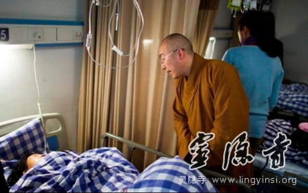 下午4点半,受方丈光泉法师委托,我寺监院妙弘法师带领寺里其他几位师父,专程前往杭州市二医院,到病房里看望了20多位受伤的香客。