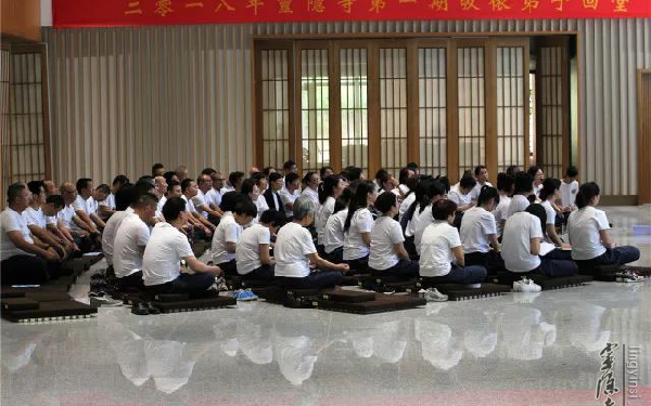 灵隐寺2018年第一期"皈依居士回堂"活动,6月15日在东阳天宝禅寺开班。 此次皈依居士回堂活动为期4天。92位皈依居士将在法师的带领下,围绕受持八关斋戒,随众学习早晚功课、上香礼佛、寺院过堂、忏摩受戒等佛门礼仪,体验出家人晨钟暮鼓的生活。 法师介绍说:这次参加回堂活动的学员,有四分之一来自浙江省外。目前,灵隐寺对皈依居士的培训工作已经进入常态化,其目的就是为大众指引一个修学佛法的入手处,指引一条按次第闻思佛法、修持佛法的途径,提升皈依居士正信正行的佛学素养;让每位皈依居士发菩提心、行菩萨道、自利利他。 学员们到达东阳天宝寺