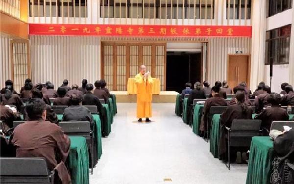 杭州灵隐寺2019年第三期"皈依居士回堂"活动于11月15日——11月18日在东阳天宝禅寺举行。四天来,来自全国各地的六十多位皈依居士在法师的带领下,围绕受持八关斋戒,随众学习早晚功课、上香礼佛、寺院过堂、忏摩受戒等佛门礼仪,体验出家人晨钟暮鼓的生活。回堂活动,场场佛事,如法如律,威仪严整,庄严肃穆。皈依居士,身心清净、法喜充满。 法师介绍说:目前,灵隐寺对皈依居士的培训工作已经进入常态化,其目的就是为大众指引一个修学佛法的入手处,指引一条按次第闻思佛法、修持佛法的途径,提升皈依居士正信正行的佛学素养;让每位皈依居士发菩提心、行