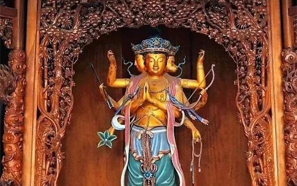 ▲杭州中天竺摩利支天塑像 农历九月初九,恭迎摩利支天菩萨圣诞。我们一起了解一下摩利支天菩萨的形象和历朝崇拜情况。 摩利支天作为佛教护法菩萨,她常以女神形象出现。摩利支天,意为“光明”、“阳焰”。梵文Marici,可译为摩梨支、摩利支天、摩利支菩萨、摩利支提婆,即阳焰。▲杭州灵隐寺大雄宝殿摩利支天像 《摩利支天经》云:“有天名摩利支,有大神通自在之法。常行日前,日不见彼,彼能见日。无人能见,无人能知,无人能害,无人欺诳,无人能缚,无人能债其财物,无人能罚,不畏怨家,能得其便。” 《大摩利支菩萨经卷一》云:“ 摩利支菩萨陀罗尼,能令有情在道路中隐身,非道路中隐身,众身中隐身,王难时隐身,水火盗贼一切诸难皆能隐身,不令得便。”▲古印度六世纪石雕 摩利支天造像▲加尔各答印度博物馆藏摩利支天像▲印度那烂陀寺遗址 出土摩利支天像 摩利支天在藏地颇受重视,又被称为“光明佛母”、“光明天母”、“积光佛母”等。她有二十多种主要的化相,包括立相的、坐相的、骑猪的、坐在车上的、一面二臂的、三面六臂的及三面八臂的化相等等,但其原本现相是三面八臂相,这个化相的其中一面是猪面,她骑在一辆由七头猪所拉的金车上。1.天女法相 摩利支天有多种法相,有一种是以天女的形象出现,坐在猪身上,左手在胸前拿着天扇或无忧枝,右手下垂,身如金色,光明如日,顶戴塔,着天衣彩裙,有腕钏、耳珰、宝带、璎珞等华严装饰。 摩利支天所乘的猪车 由七头猪挽辕拉驰 群猪之前有一菩萨 菩萨戴宝冠 有头光 裸上身 两手各上托一圆轮 2.愤怒法相 在藏传佛教中,摩利支天菩萨的法相还有以多面多臂的形式出现,她有一、三、五或六面,二、八、十、十二臂,有时还伴有胁侍,通过猪面和拉着车跑的七头猪可以认出她。 针和绳索也是她的标识,通过这个标识,人们认为她可以缝合邪恶的嘴和眼睛。 3.保护神相 在佛教特别是密宗佛教中,摩利支天有时化现成天女身相,有时化现成愤怒相,有时她还是一位很受崇拜的护法神菩萨,她是众生肉眼难以见其身形的菩萨。 她化现的保护神形象则乘着一辆由七头猪或九头猪拉的车跟着太阳奔走,没有谁能陷害她、欺骗她、束缚她,而她却能够战胜一切邪魔,救众生于一切灾厄之中,所以人们虔诚地崇拜她。 密教