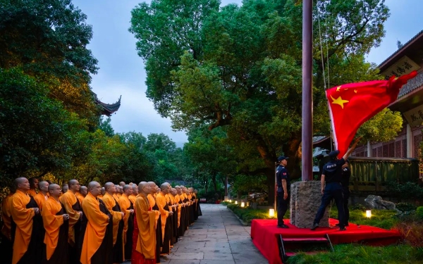 2024年10月1日清晨,杭州灵隐寺举行庆祝中华人民共和国成立75周年升国旗仪式。早上6时许,升国旗仪式正式开始。杭州灵隐寺方丈光泉大和尚率两序大众着装整齐,排班肃立。▲升旗手以一道优美的弧线将国旗向上抛展伴随着雄壮激昂的国歌声,鲜艳的五星红旗冉冉升起,光泉大和尚带领大家跟唱国歌,行注目礼。大众注视着国旗在灵隐寺上空高高飘扬,满怀崇敬之情献上对伟大祖国的美好祝福,共同祈愿国家繁荣昌盛,人民安居乐业。▲光泉大和尚带领全体僧众向国旗行注目礼在举行升国旗仪式前,光泉大和尚对于升国旗的意义作了简短开示。他表示,爱国爱教是中国佛教的优良传统。每逢重大的节庆日, 杭州灵隐寺都会在寺内举行隆重的升旗仪式,这