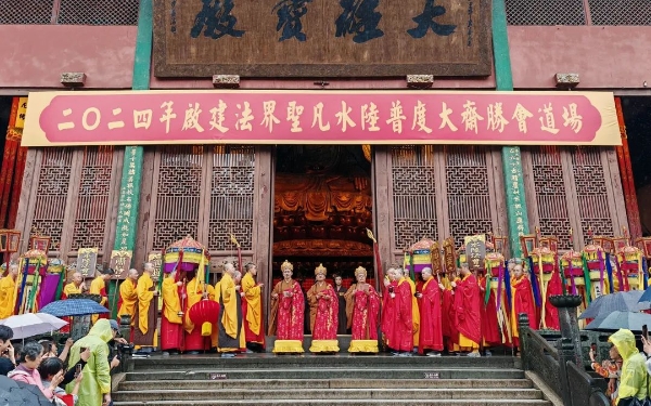 2024年10月21日,农历九月十九,恭逢观世音菩萨出家纪念日,杭州灵隐寺启建甲辰年法界圣凡水陆普度大斋胜会。10月20日傍晚18时,灵隐寺两序大众齐集大雄宝殿,举行甲辰年法界圣凡水陆普度大斋胜会薰坛洒净仪式。与会法师威仪庠序,列队前往天王殿、梵音堂(诸经坛)、祖师殿(楞严坛)、药师殿(大坛)、直指堂(净土坛)、济公殿二楼(内坛)、济公殿(华严坛)、伽蓝殿(法华坛)等处,绕寺一匝,口诵大悲咒,以杨枝净水荡尘涤垢,悉令清净。10月21日清晨7时许,灵隐寺内法幢高树、梵唱清扬,甲辰年法界圣凡水陆普度大斋胜会正式启建。主法法师在药师殿(大坛)内拈香主法,领众礼佛,诵拜《梁皇宝忏》。水陆法会之华严坛、