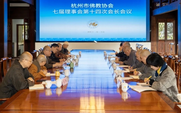 11月 20日上午,杭州市佛教协会七届理事会第十四次会长会议在市佛协会本部召开。会长月真法师,常务副会长戒兴法师,副会长智圆法师、戒清法师、念顺法师、演通法师、惟尘法师、圆诠法师、智光法师、秘书长胡胜军参加会议,常务副秘书长邓安松列席会议,市民宗局党组成员、副局长陶胜莅会指导。会议由月真会长主持。▲月真会长主持会议会议传达学习了中共中央政治局常委、全国政协主席王沪宁在第六届世界佛教论坛开幕式上的讲话精神。会议指出,第六届世界佛教论坛以“ 同愿同行 ·和合共生 ”为主题,是展现中国佛教开放包容、推动世界佛教文化传承发展、加强人类文明交流互鉴的一次盛会。会议强调,全市佛教界要深化思想认识,将讲话精