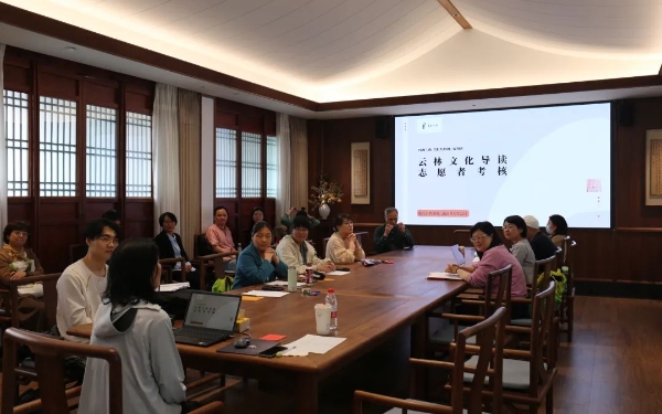 为提供更规范、更高质量的文化导读服务,书院于5月12日组织了一场面向文化导读志愿者的全面考核,共有20余位导读志愿者参与。本次考核分为实地试讲与室内抽选两部分。上午以实地走读的形式进行,志愿者们沿着流淌千年的运河进行实地走读试讲,“运河妙行”文化走读路线首尾分别有“圣因接待寺”和“香积寺”衔接,途中则以大运河文化为主题。志愿者们不仅需要对运河本身的历史文化有深入的了解,还需要能够把零散的文化点位一一串联。在这一过程中,面对环境与空间的转换,志愿者的现场导读能力和受众互动技巧都得到了考验。下午的考核转移至室内,采用了小组抽选的方式进行。志愿者们需要在限定时间内,根据抽选的顺序对云林文化走读10条