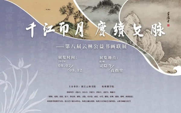 文明如水,润物无声;文脉悠远,弦歌不辍。中华大地上流动着千年的文明,保留着不断的文脉。杭州西湖文化、大运河文化和良渚文化都是我国文化遗产不断传承与延续的证明。时值大运河申遗成功十周年,为推动中华优秀传统文化创造性转化、创新性发展,鼓励社会各界热心公益,云林书院与杭州佛学院联合举办“千江印月 赓续文脉”——第八届云林公益书画作品联展。“千江印月云林公益书画联展”是浙江云林书院“社区文化共建”的经典项目,参加本届联展的单位有:三墩镇、采荷、清波、留下、拱宸桥、湖墅、灵隐、米市巷、南星、小营、紫阳、转塘、湖滨、潮鸣、西溪街道;杭州图书馆佛学分馆、浙江老干部活动中心、杭州上城区政协、杭州大名书画艺术研