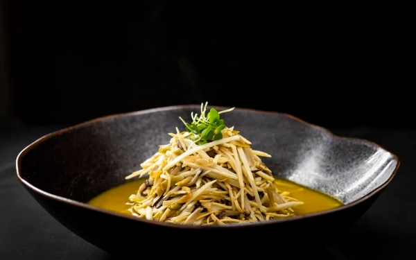 禅绣清泉(酸汤绣球菌)是清爽醇厚的酸汤与绣球菌的完美结合,口感细腻,令人唇齿留香。丝丝绣球菌,如同云朵般轻盈,漂浮在金黄色的酸汤之中。这道菜将莴笋、黄豆芽、香芹、青椒、红椒、番茄等多种蔬菜巧妙搭配,菜色鲜艳,营养丰富。原料绣球菌、莴笋、黄豆芽、香芹、青椒、红椒、花椒、杭椒、番茄、南瓜汁、香菜等。基本做法①准备食材:将绣球菌洗净备用,将小米辣和杭椒切成圈,香菜切碎,莴笋切片,黄豆芽去除根部,放入沸水里焯熟,捞出,铺在盘中做菜底。②制作过程:锅里油烧热,放入番茄炒成糊状,加南瓜汁及足量开水,调入泡椒水、盐,直至烧沸。③将绣球菌放入烧沸的汤汁中,煮至变色。④捞出绣球菌铺放在莴笋、黄豆芽上面,然后用滤