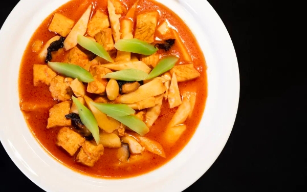 海纳百川(灵隐罗汉斋)是一道传统素菜。罗汉菜又名罗汉斋,是寺院中常食的菜品。佛教注重修行,在饮食上勤俭朴素,吃罗汉菜表达了信众敬佛、持斋、守戒的清净之心。罗汉菜制作相对简单,将选用的食材合并一锅炖煮后即成,是寺院风味之“全家福”。菜名取自“罗汉聚集一堂”之意,传递着人们对罗汉弘传佛法的敬仰。罗汉菜流传到民间素食餐馆后,其用料因时因地而异。制作方法也同中有异,但均具有咸鲜、清香、淡雅的特色。老百姓做罗汉菜,会根据季节选择不同的时令蔬菜,种类数量不等,烹饪出原料多样、口味清淡、颜色丰富的家庭罗汉菜。人们自由搭配时令蔬菜,这种“随缘”的态度,和佛教的精神有相通之处。原料西红柿、豆腐、土豆、银杏、山药