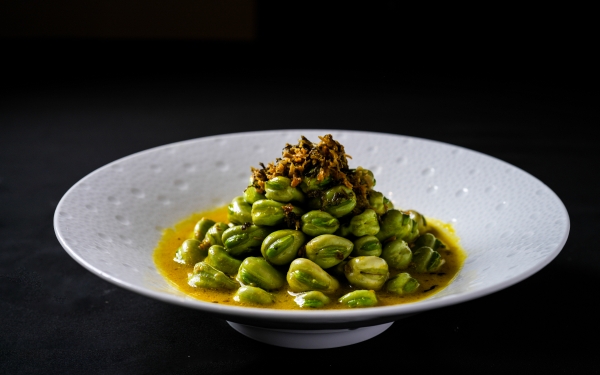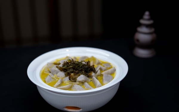 清供春晓蚕意春晓蚕意(倒笃菜烧蚕豆)是一道时令菜,翠绿的蚕豆搭配倒笃菜,色泽亮丽,口感软糯,香味十足。倒笃菜,是一种腌制蔬菜,经过严冬的酝酿、春天的发酵,味道鲜美,口感爽脆,是江南人餐桌上的常备素蔬。蚕豆,作为春夏时节的食物,其软糯的口感,丰富的营养,受到很多人的喜爱。倒笃菜的鲜香与蚕豆的甘甜相互交融,别有一番独特滋味。原料倒笃菜、蚕豆等。基本做法倒笃菜洗净备用,蚕豆洗干净后划十字刀。锅中放油烧热,倒入倒笃菜,炒至倒笃菜略干时加入盐,再加入蚕豆和清水,将蚕豆烧熟后出锅装盘。