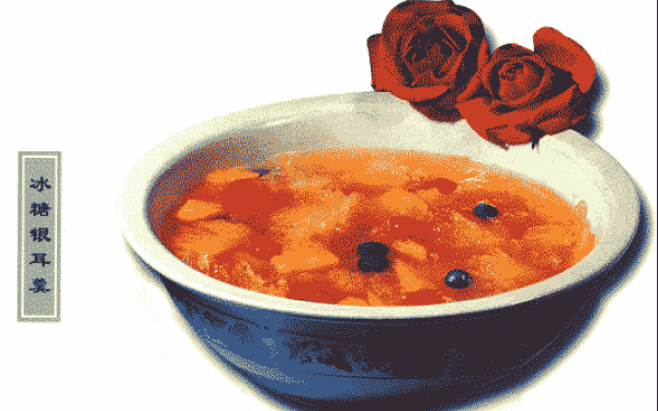 主料:银耳100克,萝卜50克,红绿樱桃少许。调料:冰糖200克,白糖50克,湿淀粉少许。