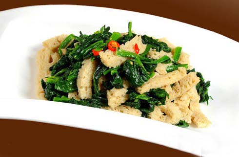 (5)烧锅倒油烧热,下入面筋翻炒一下。