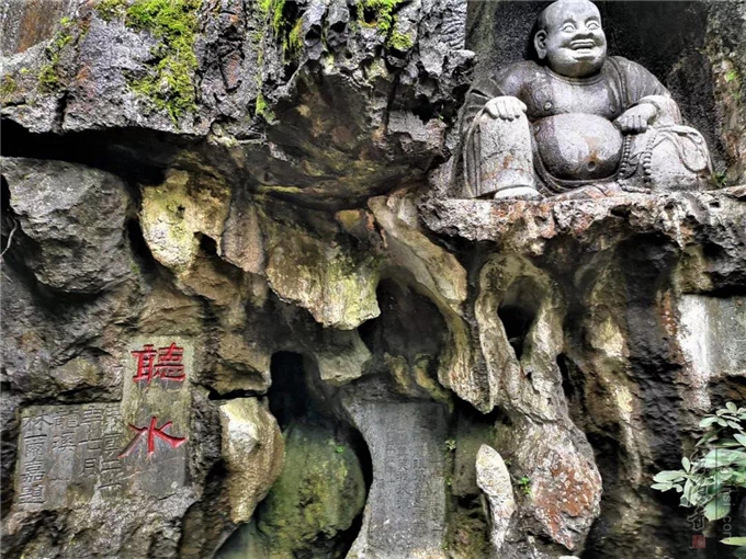 清楚地记得飞来峰崖壁上龛刻的佛像,有一尊似弥勒般和善,栩栩如生。石壁上刻"听水"二字,当时的我就在这崖壁的洞中和他一起听水,听着这来自天国的水。只可惜当初青青涩涩的年纪根本听不懂这人世间会有什么样的风,会有什么 样的雨。