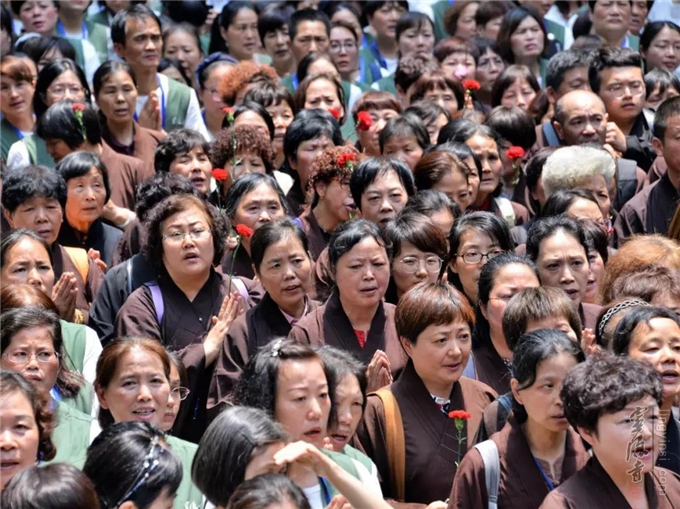 灵隐景区内的道路两边,站满了手持康乃馨的善信居士和众多游客,他们唱诵着佛号——"南无本师释迦牟尼佛"。悠扬的梵音笼罩着整个灵隐。