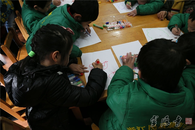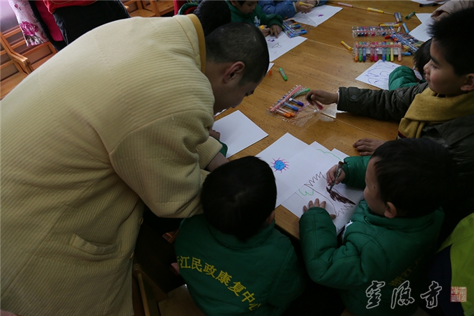 "叔叔教你画太阳"、"姐姐‘送’你一朵花",法师和居士们还现场当起了老师,手把手地教起孩子们画画儿。几个活泼的孩子骄傲地向大家展示自己完成的"大作":"这是我画的……"