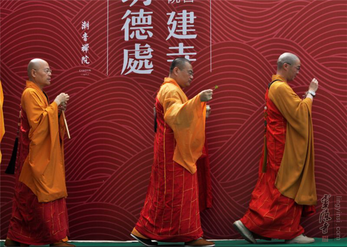 上午9时洒净仪式正式开始,由杭州市佛教协会会长、灵隐寺方丈、杭州佛学院院长光泉法师与市属各寺院方丈和尚共同拈香主法,一起手持杨枝净水,带领僧众与信众代表绕场一周洒净,祈愿佛力加持、龙天护佑。9点45分,各寺院方丈及檀越善信挥锹奠基培土,现场吉祥欢喜。